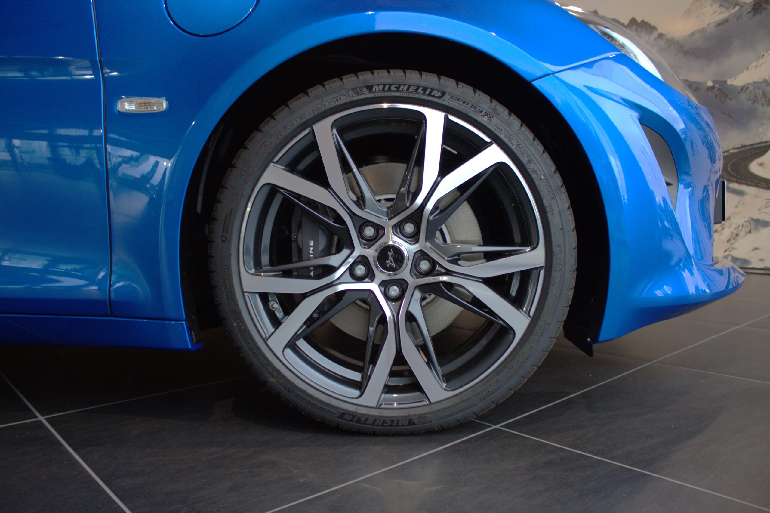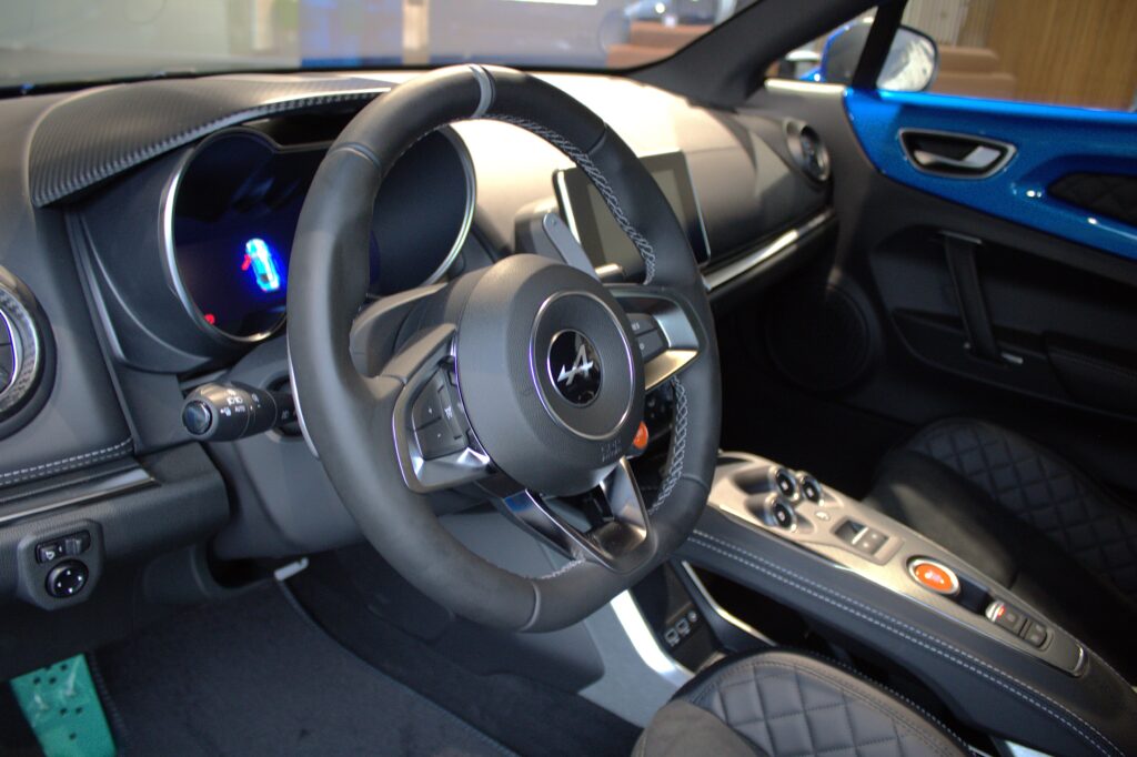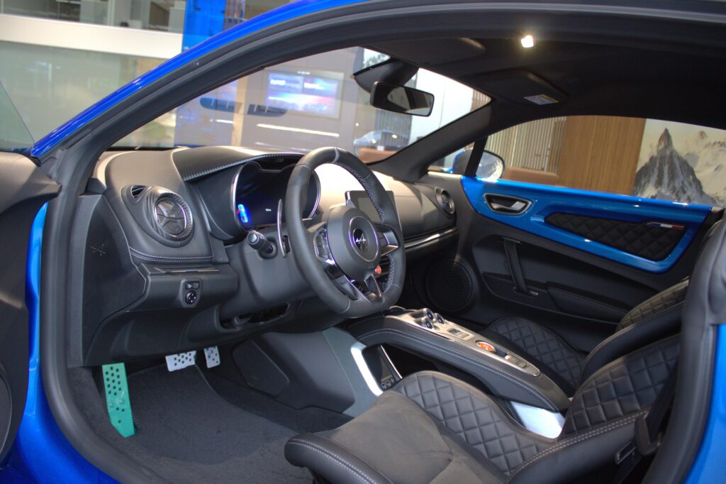 Binnenin laat de A110 zien dat lichtgewicht bouw en comfort perfect samengaan. De kuipzetels van Sabelt ® — vervaardigd uit een mix van leder en microvezel — bieden sportieve ondersteuning én houden het interieur licht. Het interieur is afgewerkt met matte carbon-inleg en een zwarte hemelbekleding, wat zorgt voor een moderne, sobere en high-tech uitstraling. Aluminium pedalen en een aluminium voetsteun voor de passagier onderstrepen de “race-inspiratie” zonder comfort in te boeten. Voor dagelijks gebruik is de A110 uitgerust met moderne gemakken: een 7-inch touchscreen-multimediasysteem met connectiviteit voor smartphone (Android Auto™ / Apple CarPlay™), automatische airconditioning, elektrische ramen en een verstelbaar sportstuur met lederen/microvezel bekleding. Zo is de A110 zowel sportwagen als praktische coupé.